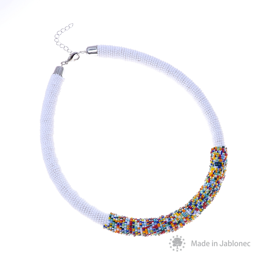 Designový náramek zajímavě vytvořený z lana, které je obtočenono na niti navlečenými skleněnými perličkami (rokjalem). Střed zdobí zajímavý multi mix, který je dotažený rokjalem v bílém odstínu. Délka náramku je 21cm + 4cm řetízková adjusta. Průměr obtáčené šňůry 12 mm. Karabina a řetízek v galvanizaci barvy platina.