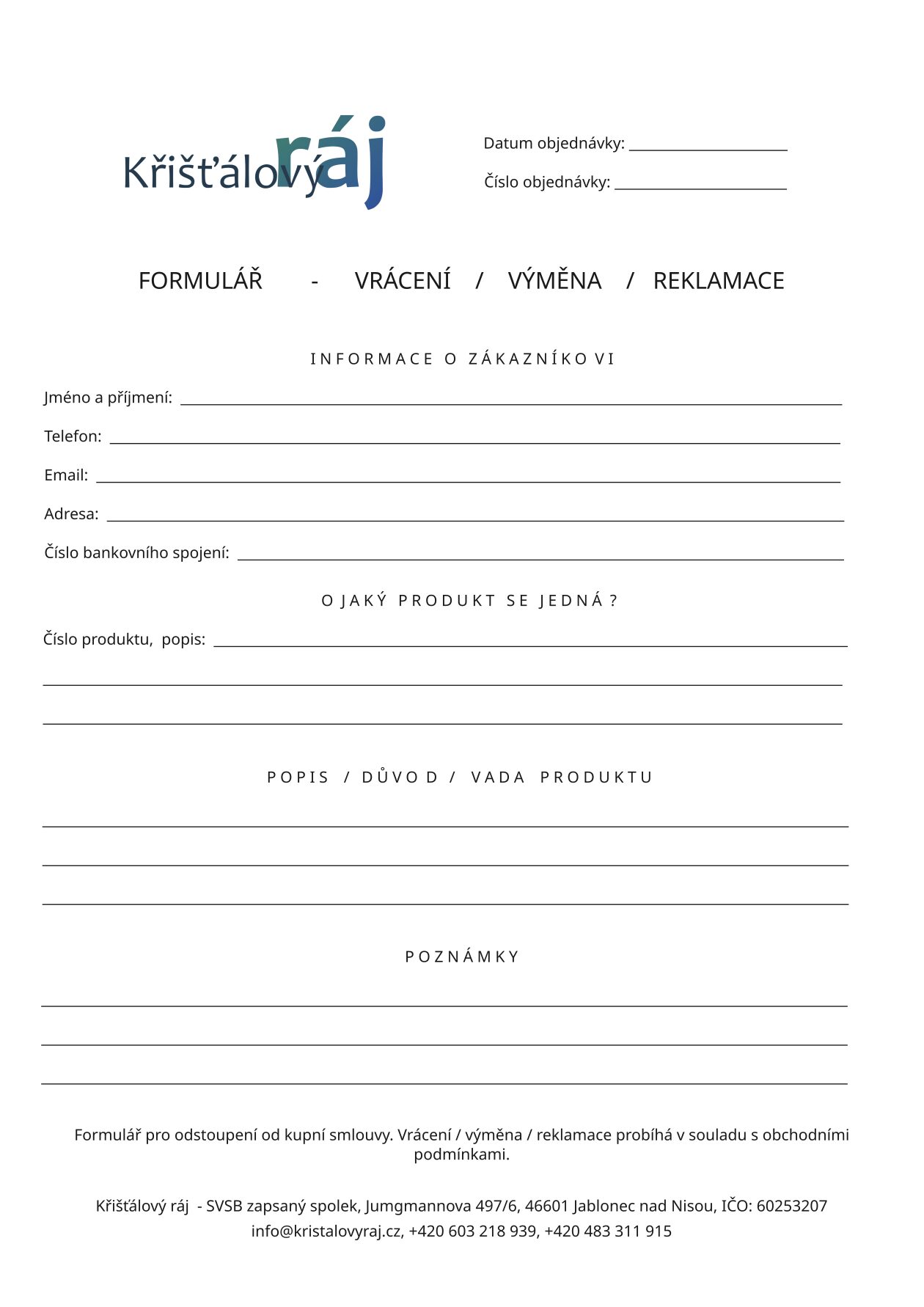 - Zásilku nám zašlete doporučeně Českou poštou na adresu: Křišťálový ráj, Jungmannova 497/6, Jablonec nad Nisou, PSČ 46601